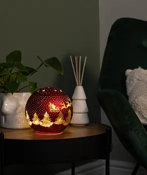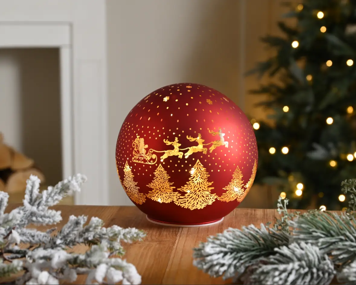 Illuminate your home this year with this light-up Red glass ball decoration. This light-up piece is perfect for any room as either an eye-catching centrepiece at the dining table or to create a dazzling window display. The lit glass ball gives the effect of an illuminated winter wonderland with silhouettes of Santa and reindeer with his sleigh flying over Christmas trees. This mesmerising light-up ball is sure to bring the festive spirit to your living space. At 15cm in size, the ball is illuminated with warm white LED lights to bring an enchanting, warm glow to your Christmas decor and an inviting atmosphere to any room. Battery operated, allowing this to be placed on the most suitable surfaces without the hassle of wires and plugs.