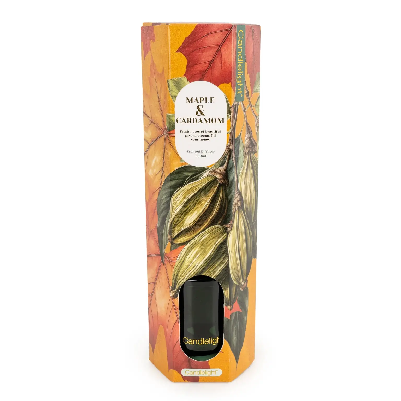 Elevate your home ambience with the 200ml Reed Diffuser in Maple & Cardamom. Housed in a chic green glass vessel with a gold-accented lid and elegant black reeds, this diffuser exudes a rich and comforting blend of sweet maple and warm cardamom. The beautifully illustrated packaging adds a touch of seasonal charm, making it an ideal gift or decorative accent. Perfect for creating a cosy and inviting environment, this long-lasting diffuser brings an indulgent autumnal scent to any room.