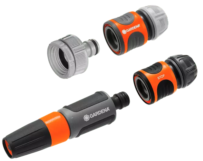 The GARDENA Basic Set supports your cleaning and watering around the house and in the garden. The starter set with cleaning nozzle, tap connector, adapter, hose connector and water stop ensures a secure garden hose connection to the tap. All parts deliver long-lasting use due to high-quality manufacture. The discreet but elegant design gives the Basic Set a look that is as stylish as it is timeless, perfectly suiting your garden or your terrace. The 2-in-1 spray jet on the nozzle provides the optimal water jet for different situations - whether the spray jet for cleaning work or the softer mist spray for irrigation, the water spray is smoothly adjustable. The water stop in the set allows you to change the attachment from a sprayer to a spray lance or sprinkler, without going to the water tap. The water stops automatically when the sprayer is removed and starts again as soon as the new attachment is connected. The GARDENA Full Set is compatible with 1/2" - 5/8" (13-15 mm) hoses, as well as suitable for water taps with 26.5 mm (G 3/4") and 33.3 mm (G 1") threads. The Basic Set is UV and frost resistant and can therefore be left outside all year round. It is made in Germany and is backed by a five-year manufacturer's warranty from GARDENA. Das Original GARDENA System.