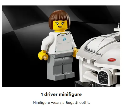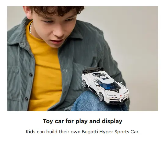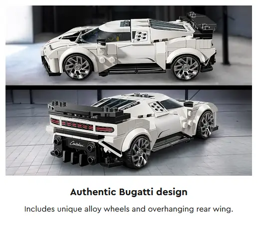 The Bugatti LEGO® car model includes the Centodieci hyper sports car’s 5 round air-intake features on the side, its unique rims, headlights, horseshoe radiator grille, overhanging rear wing and 4 rear tailpipes. The LEGO car set also comes with a Bugatti driver minifigure for kids to place behind the wheel and role-play action.