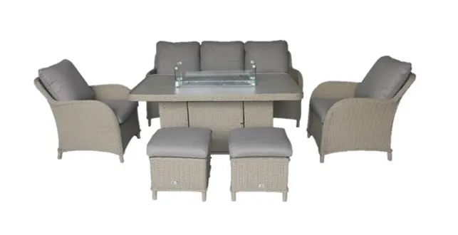 The set includes a spacious 3-seat sofa, two comfortable armchairs and two stools, all paired with a stylish rectangular firepit table. The integrated firepit adds both warmth and ambience, making it ideal for cooler evenings while doubling as a practical centrepiece for drinks and dining.