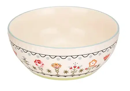 The Cath Kidston Painted Table Ceramic 26cm Large Serving Bowl is ideal for serving salads, vegetables, nibbles and desserts at your dinner party. It has a lovely retro floral pattern that trails around the middle of the bowl in hues of orange, red and blue, with black accents for a stark contrast.