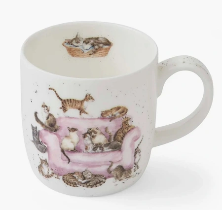 This Wrendale Designs fine bone china mug is the purr-fect way to showcase your love for all things feline. Designed by watercolour artist Hannah Dale, the front of the mug features a delightful illustration of a pink chair overflowing with adorable cats in various poses. While on the back, three playful kittens frolic around a scratching post. This mug celebrates the unique personalities and undeniable charm of our feline friends, which all cat lovers will adore.