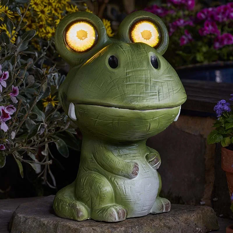 Powered by sunlight, the built-in solar panel charges during the day and lights up the eyes at night. Simply place the ornament in a sunny spot and enjoy an eye-catching feature that brings character and humour to borders, pathways and garden beds.
