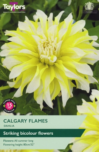 "Dahlia Calgary Flames" refers to a specific, vibrant, small-flowered decorative dahlia variety known for its bright lemon-yellow petals, often tipped with white, creating a striking bi-colour effect, popular in gardens for borders, containers, and cut flowers from midsummer until frost. It's a compact plant that thrives in full sun with well-drained soil, offering excellent summer-long performance and attracting attention with its energetic blooms.