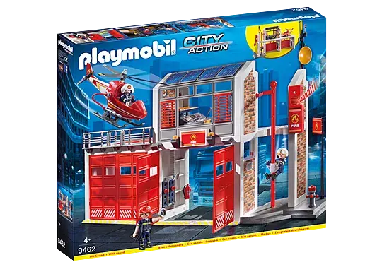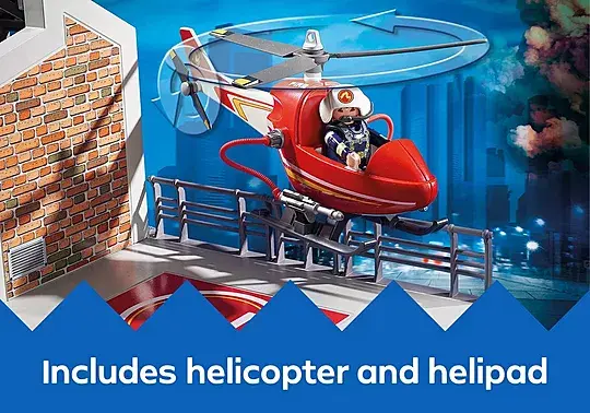 Set Includes: Figures: 1 firewoman, 2 firemen Accessories: 1 fire station, 1 helicopter, 1 flag, 1 control desk, 1 desk chair, 1 hydrant, 1 fire extinguisher, 2 files, 1 shovel, 1 broom, 1 short axe, 1 long axe, 1 megaphone, 1 digital camera, 1 radio, 1 flashlight, 1 cap, 1 flight helmet with microphone, 1 firefighter's helmet with visor, 1 pair of gloves