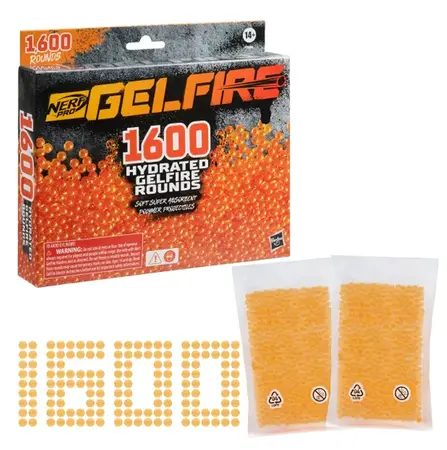 This refill includes 1600 Nerf Pro Gelfire hydrated rounds. Nerf Pro Gelfire rounds come hydrated in the box and fire from the blaster at a high velocity and burst when they hit a target. No need to pick up rounds! No one wants to run out of rounds in the middle of battle. This refill gives keeps you in the forefront of the action with 1600 Gelfire rounds. It's a great gift for teens to keep them stocked up for Nerf Pro Gelfire battles. Play to win with high-capacity Nerf Pro Gelfire blasters that deliver superior performance. Ignite your competitive advantage and break the boundaries of battle with the Nerf Pro Gelfire system! Eyewear required (not included). Blasters each sold separately, subject to availability. Outdoor use recommended. For Ages 14 and up. Nerf and all related properties are trademarks of Hasbro.