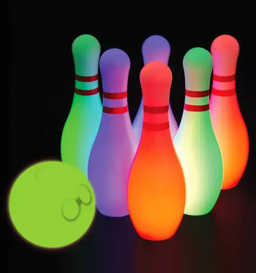 Enjoy hours of indoor or outdoor fun, daytime or nighttime with our LED Bowling ball and pins! The color changing LED Pins allow for fun family and friend competition anytime and anywhere. The LED Pins change from purple to red to green! Color light show! Easy assembly for everyone! Play anytime day or night!