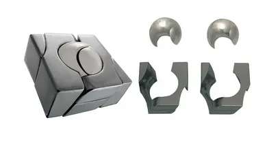 This puzzle has such a beautiful shape that it could easily be mistaken for a piece of jewelry. Its surface features extremely unusual cuts; actually, this marble is a puzzle that can be broken up into 4 pieces. This advanced design is the creation of Bram & Oskar. If you succeed in breaking up the marble, carefully examine the surface of the sections of each piece. The theme of this puzzle is “Sphere”.