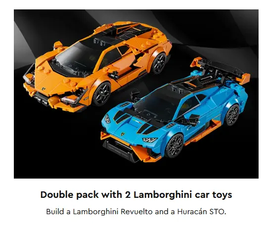 The Revuelto, with its V12 engine, is the Italian carmaker’s most powerful model ever and the Huracán STO is designed for both the street and track. Both car toys include authentic Lamborghini details from the real-life vehicles, including the air intakes, wings and futuristic Y-shaped headlights and taillights. Each toy car comes with a driver minifigure for kids to place behind the wheel and play out races.