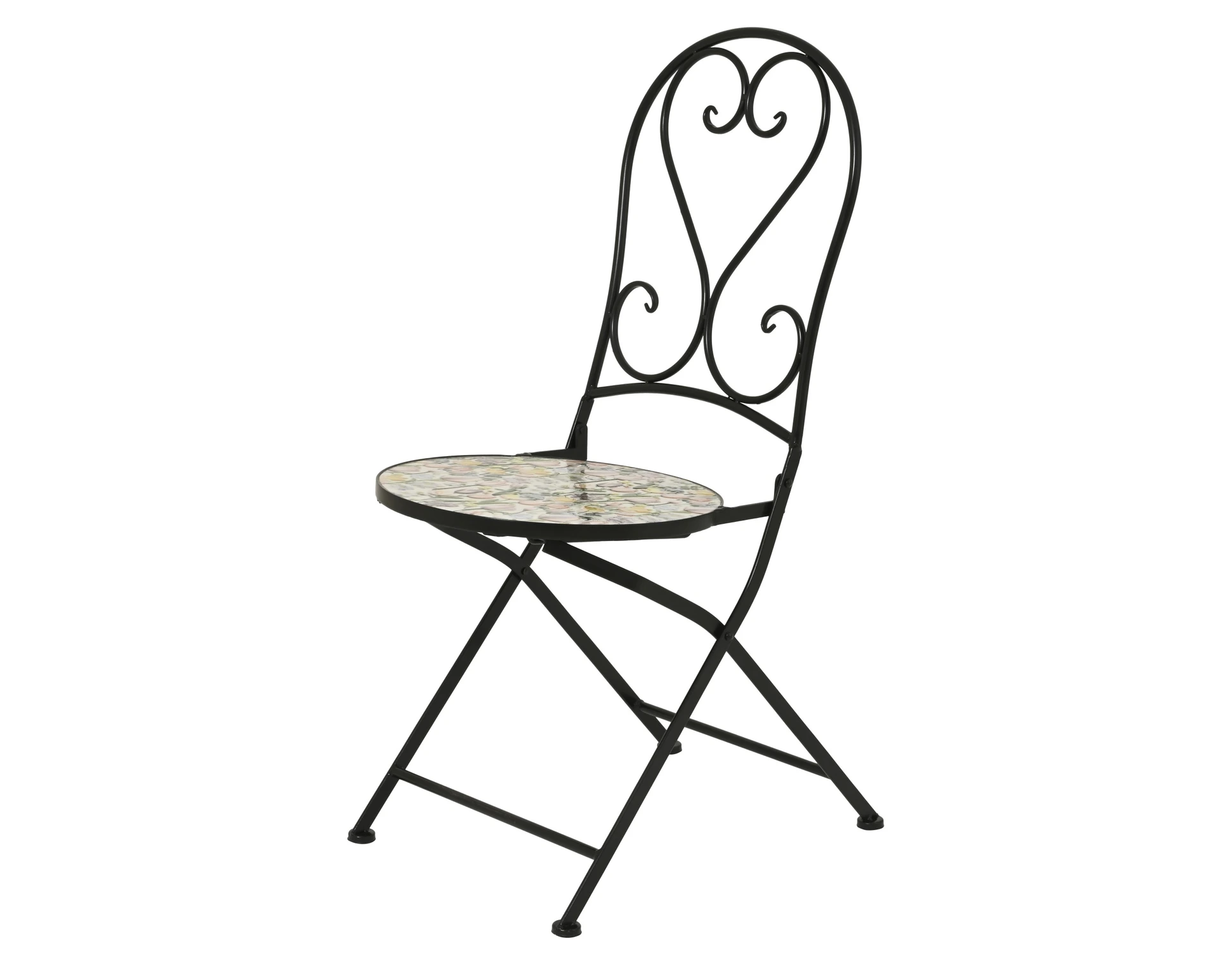 The beautifully detailed earthenware mosaic tabletop and seats add a timeless floral accent, while the sturdy steel frames are finished with e-coating and powder coating for enhanced resistance to rust, weathering, and UV exposure. Both the chairs and table are fully foldable, making them easy to store when not in use.