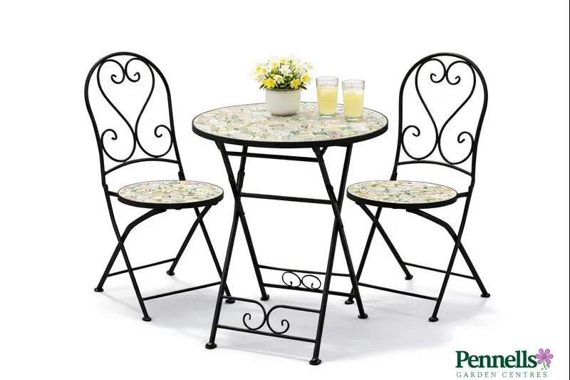 Create a charming outdoor dining space with this elegant mosaic bistro set, featuring two folding chairs and one matching round table. Designed to bring colour and character to patios, balconies, and garden corners, this set combines decorative style with practical durability.
