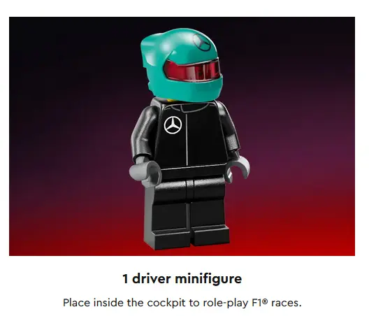 The F1 model car features a cockpit that opens by lifting the halo bar, a rear wing, wishbone suspension, sponsor stickers and wider rear tires imprinted with “Pirelli.” The buildable model also comes with a driver minifigure in a Mercedes-AMG PETRONAS F1 Team outfit and a winged helmet to place inside the cockpit and stage races.
