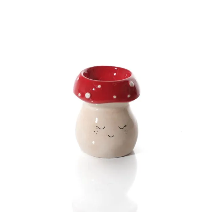 Ceramic wax melt burner shaped like a mushroom with a red top featuring white spots and a beige base with a smiley face design.