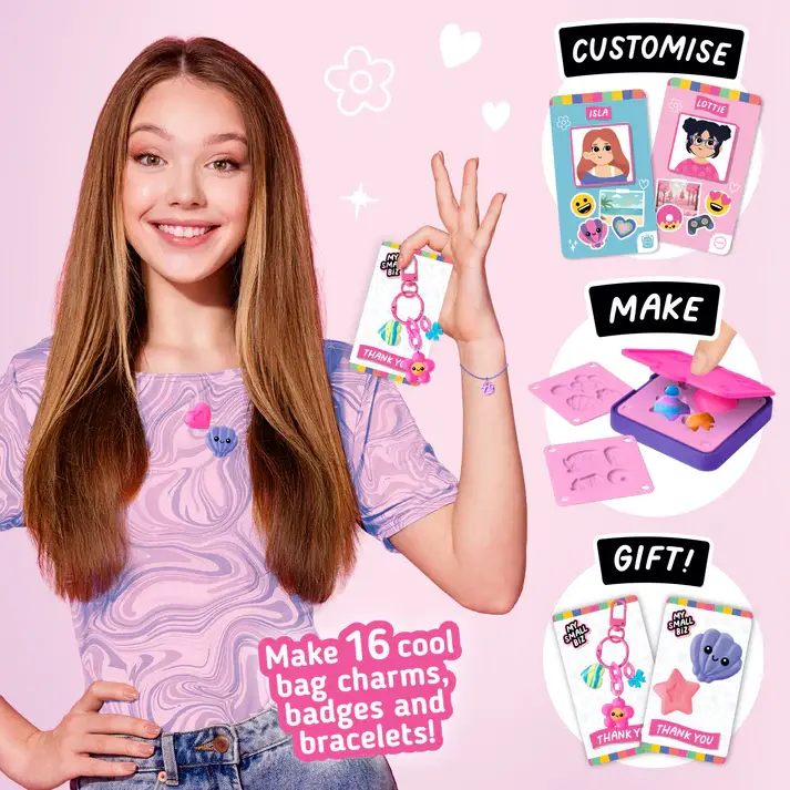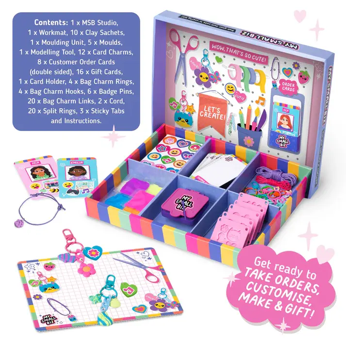 1 My Small Biz Studio, 1 Workmat, 10 Clay Sachets, 1 Moulding Unit, 5 Moulds, 1 Modelling Tool, 12 Card Charms, 8 Double-Sided Order Cards, 16 Gift Cards, 1 Card Holder, 4 Bag Charm Rings, 4 Bag Charm Hooks, 6 Badge Pins, 20 Bag Charm Links, 2 Cords, 20 Split Rings, 3 Sticky Tabs & Instructions.