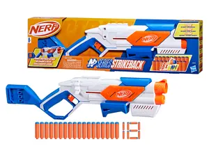 From the creators of the foam dart, the Nerf brand unleashes the next evolution in foam dart blasting with Nerf N Series N1 darts, delivering EXTREME ACCURACY, SPEED and DISTANCE! The Nerf N Series Strikeback dart blaster features powerful snapback action! You can see and feel the cool snapback action when you pull the trigger! The blaster has an internal clip with 6-dart capacity. It includes 18 Nerf N1 darts, giving you additional darts for reloads, which you can keep nearby thanks to the blasters onboard 12-dart storage. A great outdoor toy blaster for children ages 8 and up! Nerf N Series blasters are compatible only with Nerf N Series N1 darts. Eyewear recommended (not included). NERF and HASBRO and all related trademarks and logos are trademarks of Hasbro, Inc.