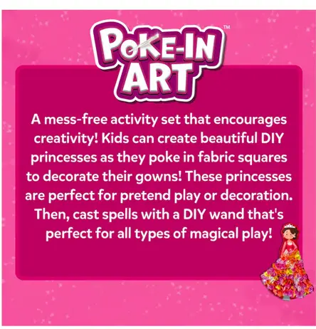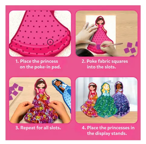 Contents: 700+ Fabric Squares, 6 Foam Princesses, 1 Magical Wand, 1 Foam Star, 6 Stands, 2 Poke-in Sticks, Poke-in Pad, An Instruction Manual