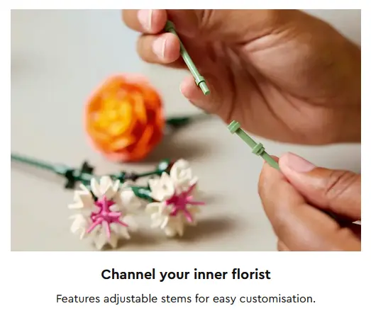 Budding florists can relax and unwind as they build the bouquet, which consists of 15 LEGO flower stems, including daisies, cornflowers, eucalyptus, elderflowers, roses, ranunculus, cymbidium orchids, a waterlily dahlia and a campanula. All the stems are adjustable, encouraging builders to arrange a bespoke bouquet that they can use as floral home or office decor. For added customization, the flowers can be arranged with other LEGO bouquets, sold separately, to create a larger, unique floral display.