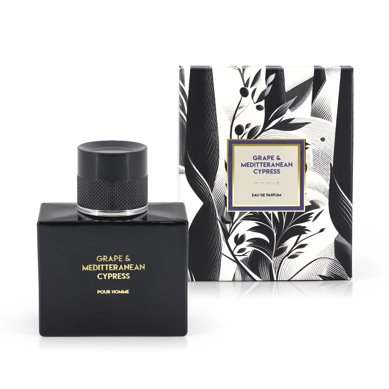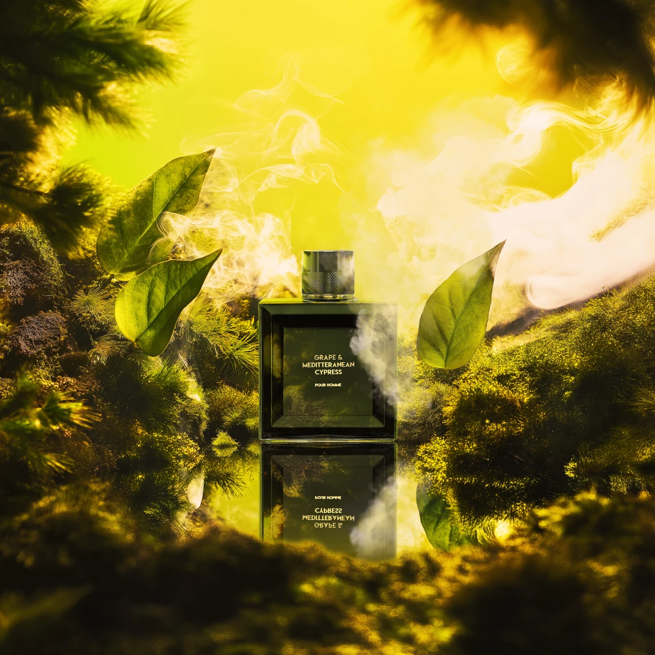 Opening with crisp, resinous cypress, this fragrance delivers a clean, green freshness that feels uplifting and energising. As it develops, a smooth heart of grape, cedarwood and vetiver creates a balanced blend of woody depth and subtle fruitiness, giving the scent its unique character.