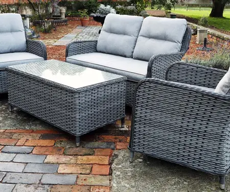 The slender Rydal Lounge Set permeates sophistication and style. Using a 12mm hook weave back to back and hand woven around the main body of the aluminium frames, utilising a 5mm round weave detailing the edges creates a stunning collection. With the unique double hook weave the Rydal has a soft textured appearance complemented with luxurious Ash Grey fabric cushions which are zipped for easy removal for cleaning. The distinct weave is a synthesis of quality and style. Combined with an intimate lowered coffee table, the Rydal lounge set is a delightful spot to enjoy your garden space.