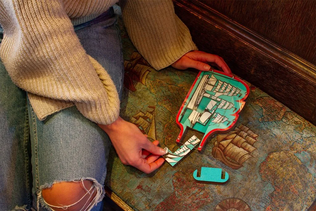 Gently shake all the pieces out of the bottle. Use your powers of deduction and a gentle touch to reassemble all the pieces inside the bottle, creating the finished image. Will it be plain sailing or will you get sea sick?