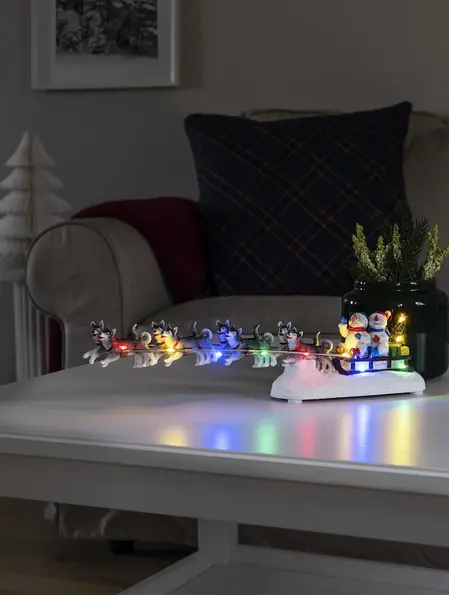 A winter wonderland! Welcome the festive season with this charming battery-operated snowmen in a dog sleigh. Illuminated by multicolour LEDs, this sweet display will bring warmth and cheer to any home. Make your holiday magical with this delightful decoration!
