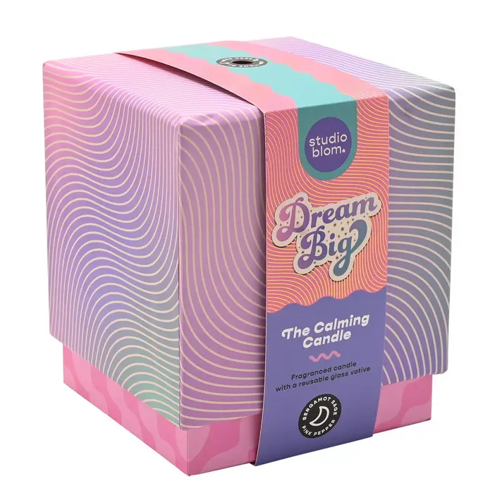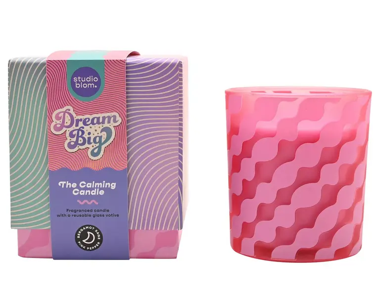 This pink wavy-patterned candle, encased in a patterned box, truly embodies the phrase "Dream Big". Perfect for creating a warm and inviting atmosphere, this candle also serves as a constant reminder to chase your dreams. The vibrant colour scheme and fun, friendly design make it an ideal gift or personal keepsake, sure to brighten anyone's day.