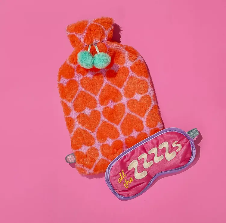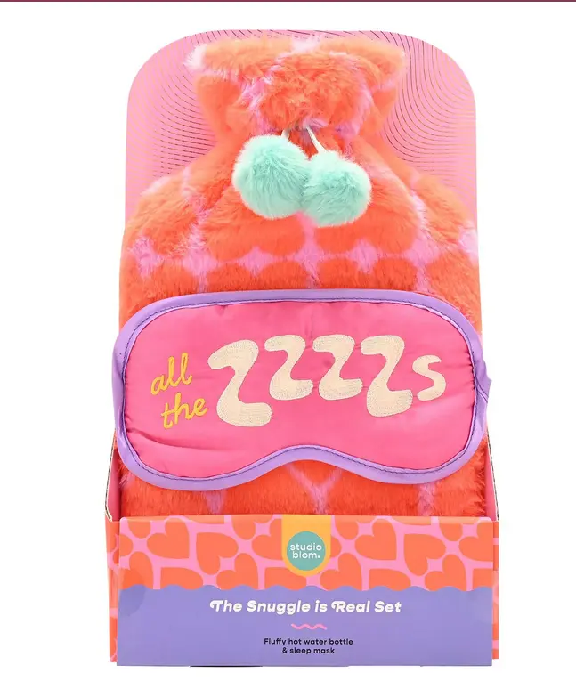 Featuring a vibrant plush hot water bottle cover and a matching eye mask with playful “The Zzzzs” text, in stand-out gift-ready packaging.
