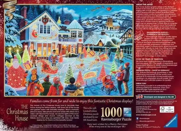 The owners of The Christmas House love to decorate their home during the festive season, and visitors of all ages come from far and wide to enjoy the wonderful display! The historic house is dripping in lights, garlands are wrapped around the porch and Christmas Crackers, stars, garlands and a large Santa in his sleigh adorn the front of the building. In the garden there are super-sized gifts and baubles, Nutcracker figures stand guard, alongside an angel, another Santa, sleigh and lots of brightly-lit trees. Beyond the house, we can see the lights of the pretty village and church, and distant, snow-covered hills. But wait! It looks like the display is so bright, that even Father Christmas has come to take a quick look! This is the 25th Limited Edition Christmas design developed by our UK-based team. Includes printed box base with extra puzzle image and artist information.