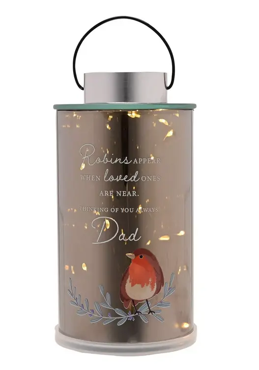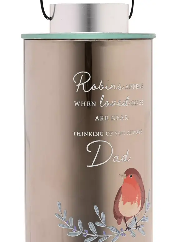 This decorative metal lantern features a robin illustration and the heartfelt text, "Robins appear when loved ones are near. Always with you, Dad". Combining a classic design with a touching message, it celebrates the unique bond between father and child.