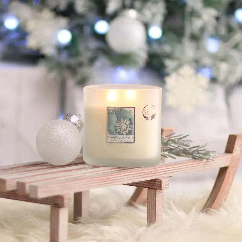 The Heart and Home Twin Wick Candle is designed to look beautiful anywhere. With a contemporary frosted glass ellipse shape, this elegant candle will fill the home with a wonderfully heartwarming aroma. Snowflake Sparkle simply dazzles with bergamot and yuzu, blending into a heart of snowdrops and freesia. With undertones of vanilla and cashmere musk to create a warm, enchanting finish. Two natural cotton wicks will give a clean burn of up to 40 hours with wonderful aroma.
