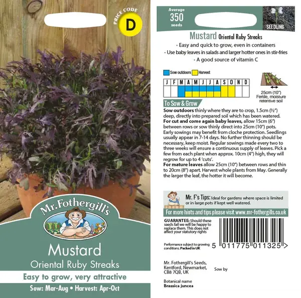 Salad Leaves Mustard Oriental Ruby Streaks Seeds are a fantastic choice for those who enjoy a quick-growing, versatile addition to their garden. These mustard leaves are easy to grow, thriving in containers as well as traditional garden beds. Their vibrant, ruby-red leaves add colour and spice to your meals, making them a popular choice for both seasoned gardeners and newcomers alike.