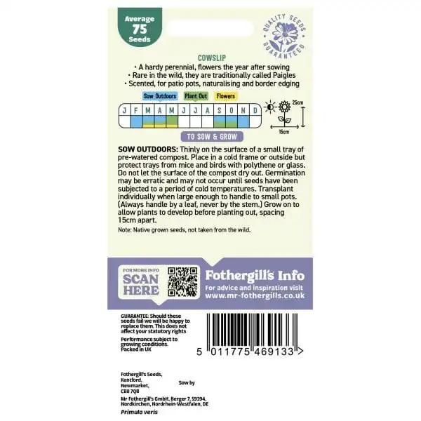 Nature's Helpers Primula Cowslip Seeds are early flowering treasures, part of the Nature's Helpers range promoting pollinator-friendly gardens. Hardy perennials with soft yellow blooms from March to May, they thrive when sown thinly on pre-watered compost outdoors or in a cold frame. Transplant seedlings to 15cm spacing, ensuring protection from wildlife during establishment. Fothergill's high-quality seeds, with a 100% germination guarantee, help gardeners create memorable spring displays while encouraging bees and beneficial insects to visit grassy areas and borders.