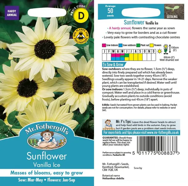 With their long-lasting blooms, Sunflower Vanilla Ice is perfect for both fresh bouquets and dried arrangements. Whether you're looking to brighten your garden or add a touch of elegance to your floral displays, this easy-to-grow variety from Fothergill's offers reliable beauty and a burst of colour all season long.