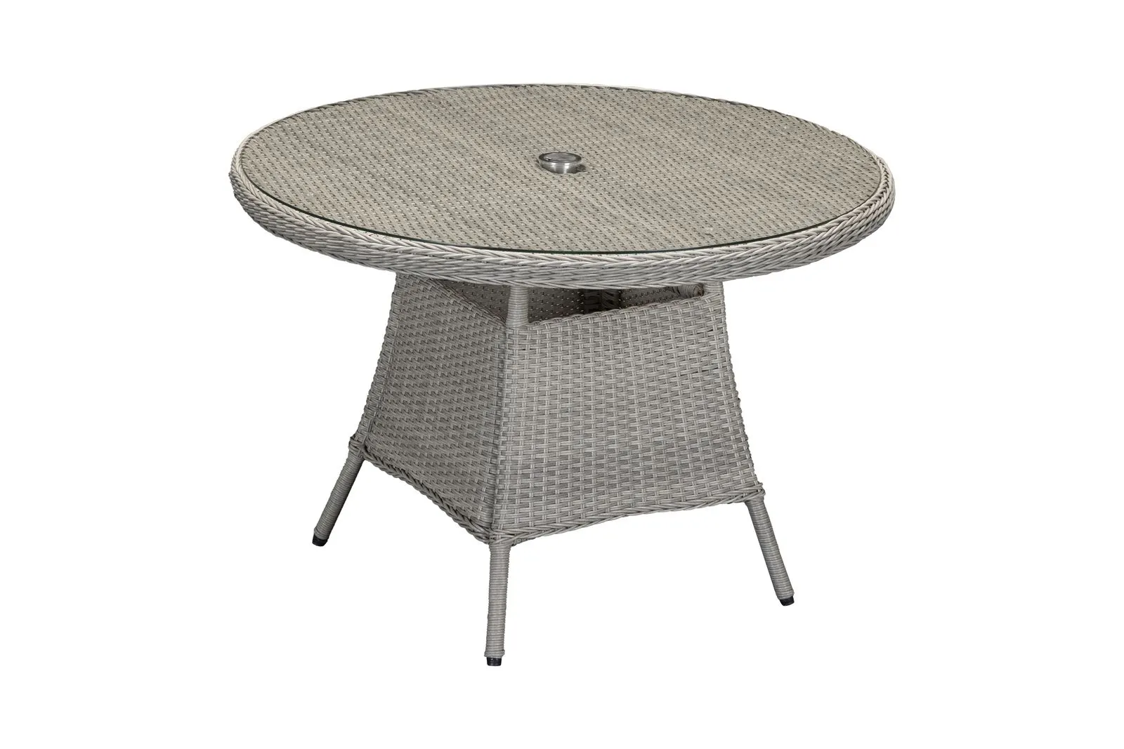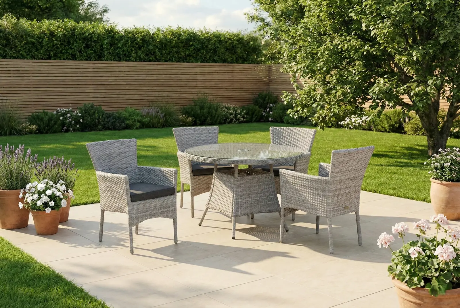 - Complete outdoor dining set: 1 x 110cm round table & 4 x chairs