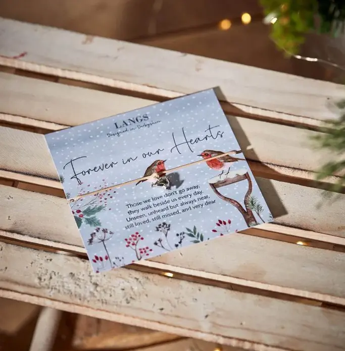 Celebrate cherished memories with this heartfelt card featuring "Forever in our Hearts" text and delicate robin illustrations. The winter botanical design adds a seasonal touch, while the attached bracelet makes it a meaningful keepsake. Complete with an envelope, this thoughtful gift is perfect for expressing love and remembrance during the festive season.