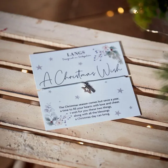 1 star-shaped metallic bracelet attached to a white Christmas wish card with printed floral graphics and holiday-themed text, includes 1 matching envelope.