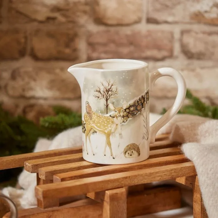 White ceramic jug featuring illustrations of woodland animals, a stone wall, snow-covered trees, a cottage, and a winter landscape. Handle on one side and spout on the other.